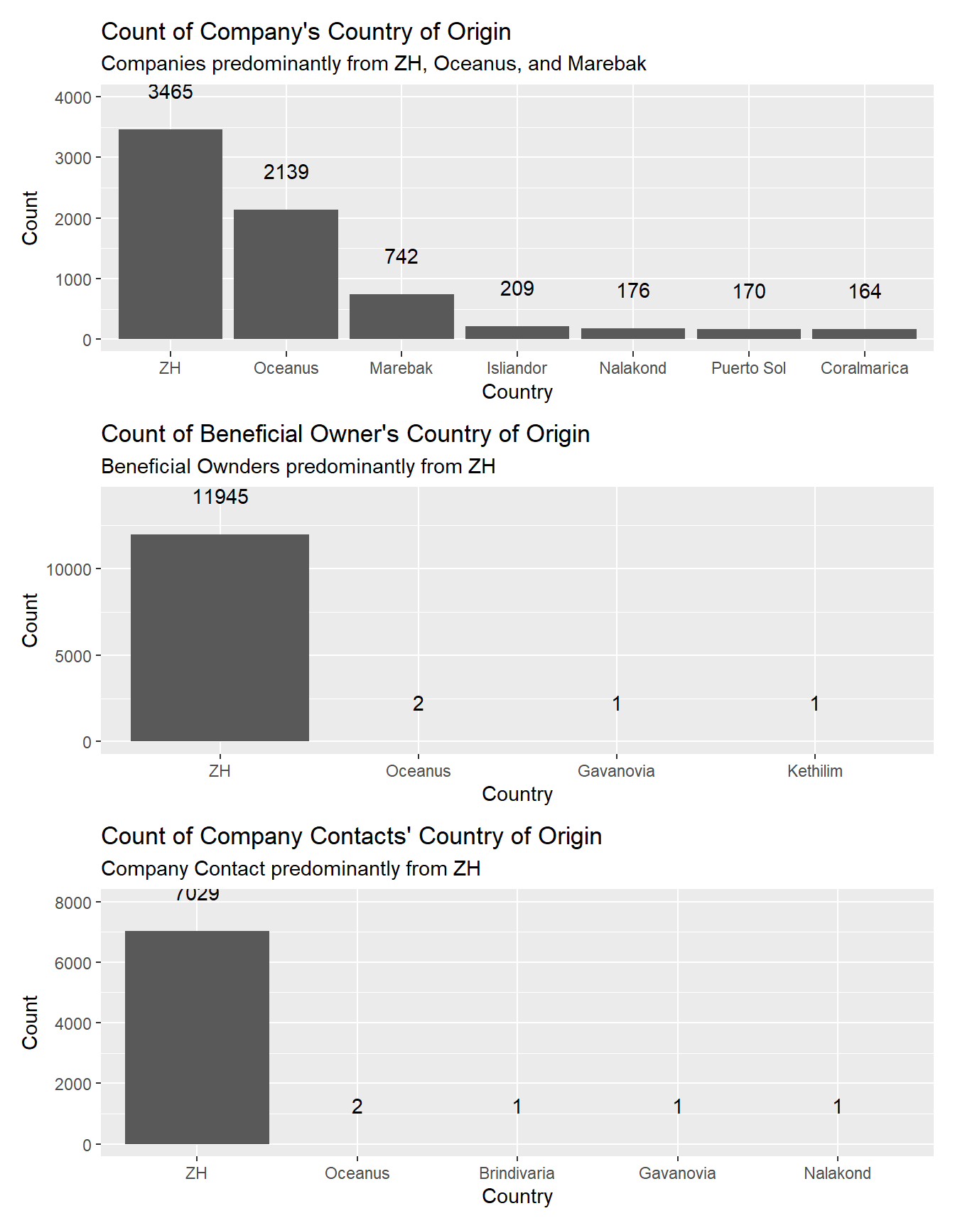 title = "Count of Company Contacts' Country of Origin", y= "Count", x = "Country", subtitle = "Company Contact predominantly from ZH"