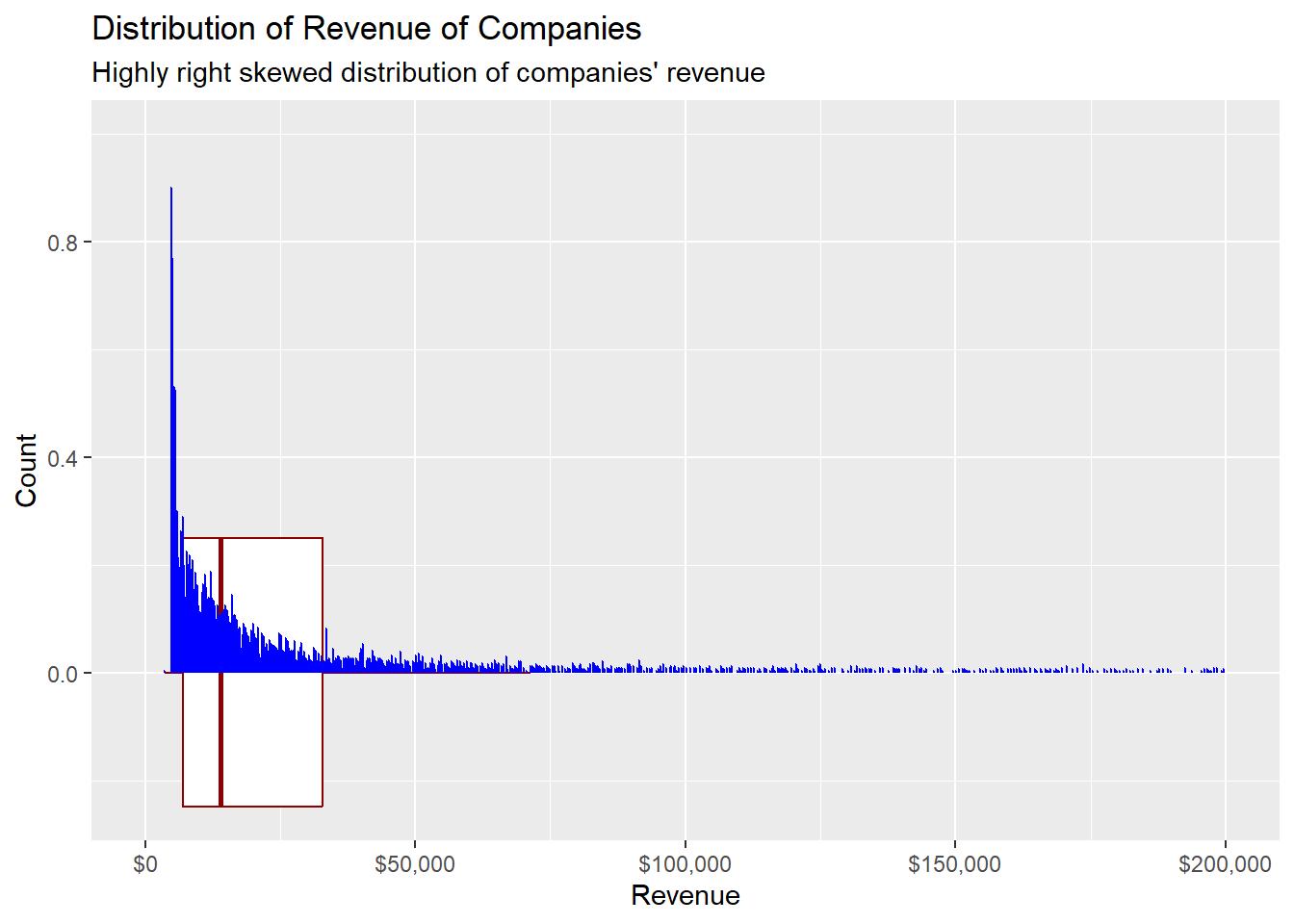 title = "Distribution of Revenue of Companies", y= "Revenue", x = "Count", subtitle = "Highly right skewed distribution of companies' revenue"