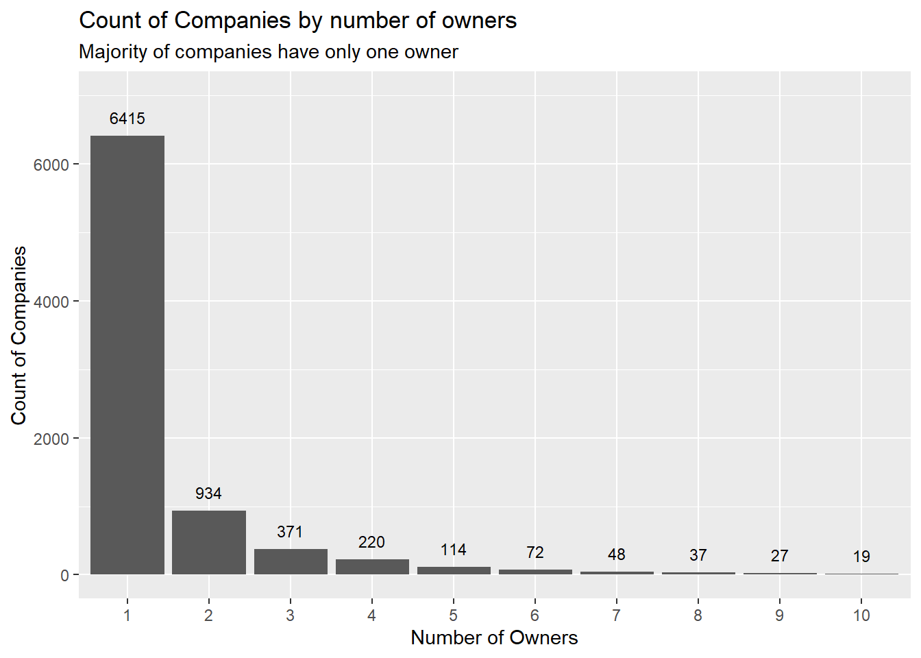 title = "Count of Companies by number of owners", y= "Count of Companies", x = "Number of Owners", subtitle = "Majority of companies have only one owner"