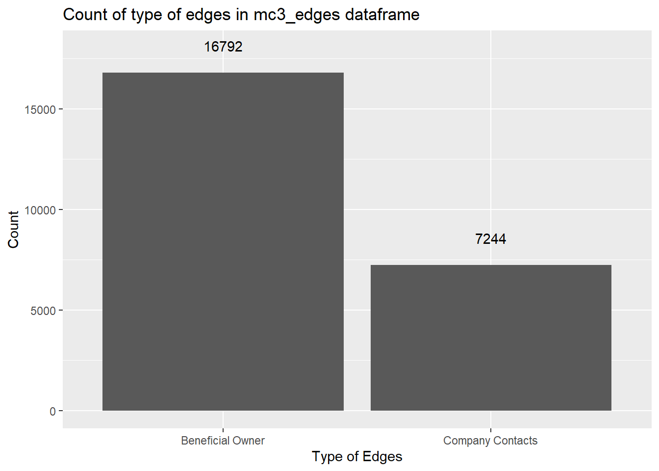 To further explore the count of each type of contact, we plot a bar chart of the type of edges in the mc3_edges dataframe.